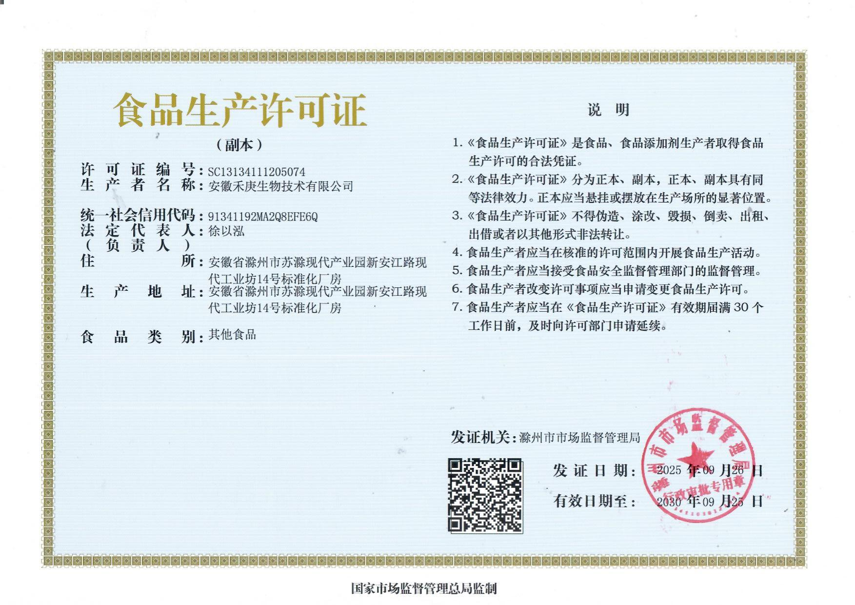 食品生产许可证-安徽禾庚生物技术有限公司